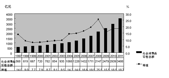 在区位优势及宏观经济政策的带动下,重庆市商贸规模呈现快速扩张趋势,总体水平显著提升。 2011年全市实现社会消费品零售总额 3487.81亿元,较直辖初翻了两番多,总体规模跃上新台阶; 15年间消费品市场保持高增长态势,其中 9年增速达到两位数;年均增长 13.8%,比全市 GDP平均增速高 1.6个百分点,实现了商贸跨越式发展。
