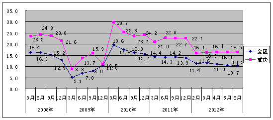 2008 年以来全国及重庆各季度规上工业增速( %)