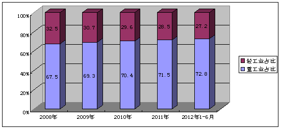 上半年,全市规模以上重工业实现总产值 4455.33亿元,同比增长 19.7%,拉动全市增长 14.2个百分点,贡献率为 74.1%;轻工业实现总产值 1666.61亿元,增长 18.2%,较重工业低 1.5个百分点。 2008年以来,重工业占比由 67.5%到 2010年的 70.4 %,再到今年上半年的 72.8%,呈逐年上升态势,重型化特征日趋明显。