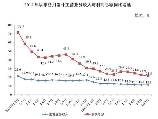 1-10 月份,在 39个工业大类行业中, 37个行业盈利, 2个行业亏损,其中, 1个行业由同期亏损转为盈利。主要行业利润增长情况:汽车制造业增长 17.9%,计算机、通信和其他电子设备制造业增长 61.2%,铁路、船舶、航空航天和其他运输设备制造业增长 17.4%,非金属矿物制品业增长 21.2%,电力、热力生产和供应业增长 5.0%,电气机械和器材制造业增长 23.5%,农副食品加工业利润总额同比增长 56.7%,通用设备制造业增长 20.7%,化学纤维制造业由同期亏损转为盈利,黑色金属矿采选业和黑色金属冶炼及压延加工业比同期亏损增大。