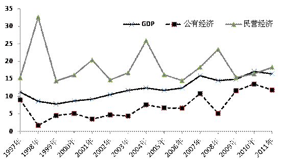 直辖以来,重庆民营经济增加值呈现快于全市经济特别是公有制经济的发展态势, 1997-2011年年均增长 18.5%,分别高于 GDP和公有制经济 6.3个和 11.4个百分点,民营经济成为重庆经济发展的重要增长动力(见图 2)。