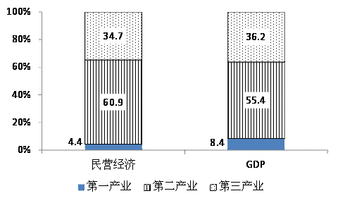 从产业结构看,在第三产业中传统服务业仍占主体地位,新兴服务业明显滞后;从行业结构来看,由于受市场准入和自身力量的局限,真正占有较大比重、具有影响力和竞争力的行业主要集中分布在进入门槛低、技术含量不高、竞争性弱、劳动密集型为主的行业,如批发零售餐饮业、交通运输业、仓储业、农林牧渔业等;在科技含量高、资金密度高、市场准入壁垒高、利润率高的行业则数量相对较少。
