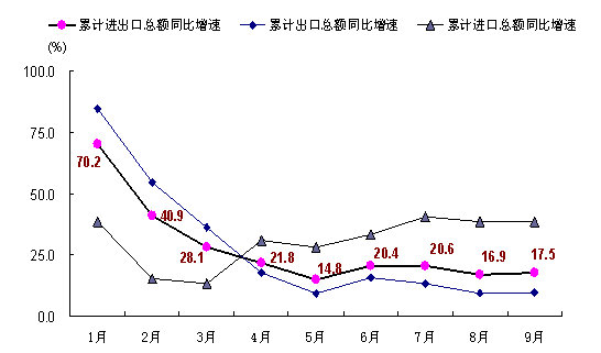1-3 季度, 重庆进出口总额 474.23亿美元,同比增长 17.5%。其中 出口总额 322.14亿美元,同比增长 9.7%;进口总额 152.09亿美元,同比增长 38.5%。重庆市进出口、出口、进口的增速高出全国平均水平 9.8、 1.7和 31.2个百分点,