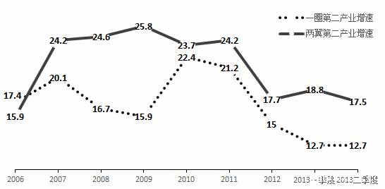 图 3: 2006年以来“一圈”和“两翼”第二产业增加值增速