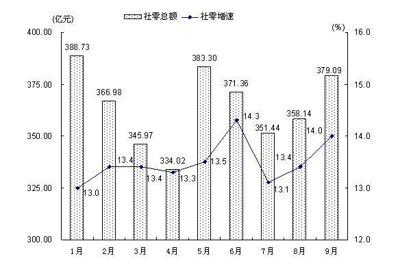 第三季度,全市消费品市场逐月趋暖,9月份全市消费品零售总额增长14.0%,比8月份高0.6个百分点,比7月份高0.9个百分点(见图1)。