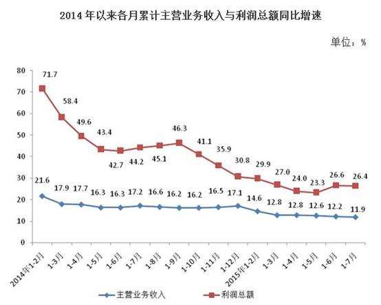 1-7 月份,在 39个工业大类行业中, 37个行业盈利, 2个行业亏损,其中, 2个行业由同期亏损转为盈利。主要行业利润增长情况:汽车制造业增长 27.5%,计算机、通信和其他电子设备制造业增长 49.9%,铁路、船舶、航空航天和其他运输设备制造业增长 24.1%,非金属矿物制品业增长 24.6%,电力、热力生产和供应业增长 28.2%,电气机械和器材制造业增长 12.0%,农副食品加工业利润总额同比增长 48.2%,通用设备制造业增长 21.3%,化学原料和化学制品制造业、有色金属冶炼及压延加工业由同期亏损转为盈利,黑色金属矿采选业和黑色金属冶炼及压延加工业比同期亏损增大。