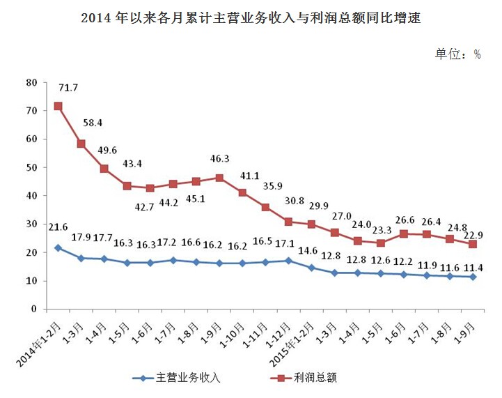 1-9 月份,在 39个工业大类行业中, 37个行业盈利, 2个行业亏损,其中, 3个行业由同期亏损转为盈利。主要行业利润增长情况:汽车制造业增长 18.8%,计算机、通信和其他电子设备制造业增长 60.6%,铁路、船舶、航空航天和其他运输设备制造业增长 19.4%,非金属矿物制品业增长 23.5%,电力、热力生产和供应业增长 3.7%,电气机械和器材制造业增长 22.8%,农副食品加工业利润总额同比增长 60.1%,通用设备制造业增长 24.4%,化学原料和化学制品制造业、化学纤维制造业、有色金属冶炼及压延加工业由同期亏损转为盈利,黑色金属矿采选业和黑色金属冶炼及压延加工业比同期亏损增大。
