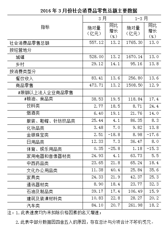 按消费类型分, 3月份,商品零售 473.71亿元,同比增长 13.2%; 餐饮收入 83.41亿元,增长 13.6%。 1-3 月份,商品零售 1508.50亿元,同比增长 12.9%;餐饮收入 256.80亿元,增长 13.6%。