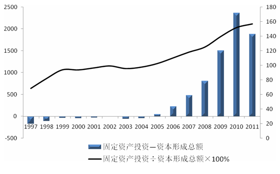 如图 1所示,从 2006年开始,土地出让金大幅增加,年均增速超过 50%,导致重庆市固定资产投资快速增长,迅速拉大与资本形成总额的差距。到 2011年重庆市固定资产投资高出资本形成总额 1874.29亿元;两者比例关系逐年上升,由 1997年的 68.3%变为 156.6%,差距已超过 50%。