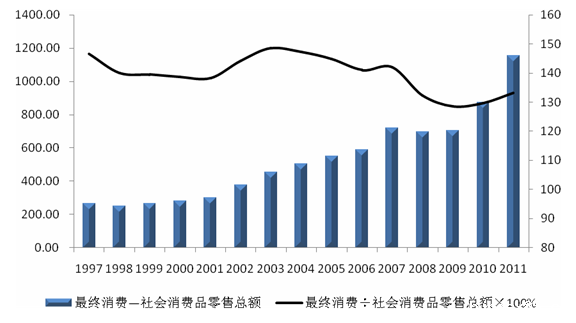 如图 2所示,直辖以来重庆市最终消费一直大于社会消费品零售总额,两者差额呈逐步扩大趋势。 2011年重庆市最终消费高出社会消费品零售总额 1153.83亿元,差额是 1997年的 4.4倍。但两者总量的比例关系相对比较稳定, 15年中两者比例主要集中在 130%-150%之间,没有大幅波动。