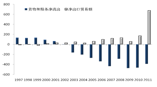 三、货物和服务净流出与净出口贸易额无明显相关性