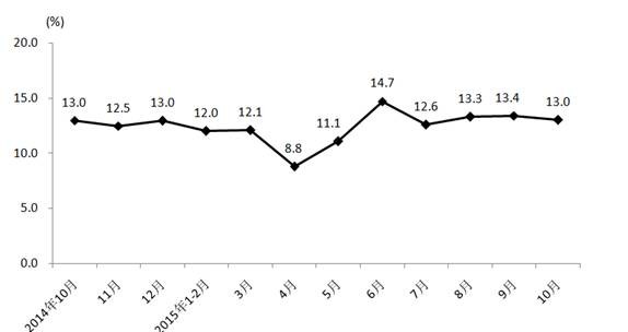 按经营单位所在地分, 10月份,城镇消费品零售额 555.61亿元,同比增长 13.0%;乡村消费品零售额 27.64亿元,增长 12.8%。 1-10月份,城镇消费品零售额 4981.63亿元,同比增长 12.3%;乡村消费品零售额 263.47亿元,增长 12.4%。
