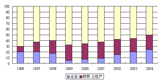 从直辖以来的情况看,政府部门可支配收入比重基本保持在25%左右;企业部门可支配收入比重则经历了1999年的低谷后持续攀升,2004年达到了直辖以来的峰值24.5%;居民部门可支配收入比重则逐年回落,2004年回落到50.5%,但仍为三者中的最大份额占有者。居民、企业、政府收入分配日趋合理。