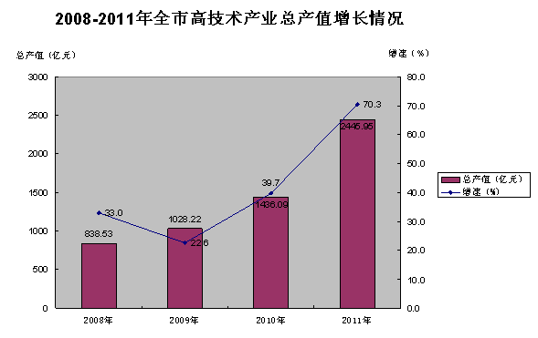 2011 年,全市高技术产业(不含电信、邮政、科研、综合技术服务、地质勘探行业)完成总产值 2445.95 亿元,同比增长 72.5 % ;完成新产品产值 1161.60 亿元,同比增长 89.8 % ;实现主营业务收入 2320.60 亿元,同比增长 69.7 % ;实现利润总额 96.31 亿元,同比增长 29.6 % ;实现增加值 738.32 亿元,同比增长 77.1 % 。 全市高技术企业总产值超十亿元以上的企业已达 34家,以 达丰(重庆)电脑有限公司、鸿富锦精密电子 (重庆 )有限公司、纬创资通(重庆)有限公司、格力电器(重庆)有限公司、英业达 (重庆 )有限公司、重庆海尔空调器有限公司、仁宝电脑(重庆)有限公司 等为代表的一批重点骨干高技术企业集团发展势头强劲,这些骨干企业 完成总产值达 1589.38 亿元,拉动高技术产业总产值增长 54.3%, 对高技术产业总产值增长的贡献率达到 75.3 %。 自 2008年以来,我市高技术产业总产值相继突破 800亿元、 1000亿元、 1400亿元、 2400亿元,高技术产业发展连续四年迈上新台阶。