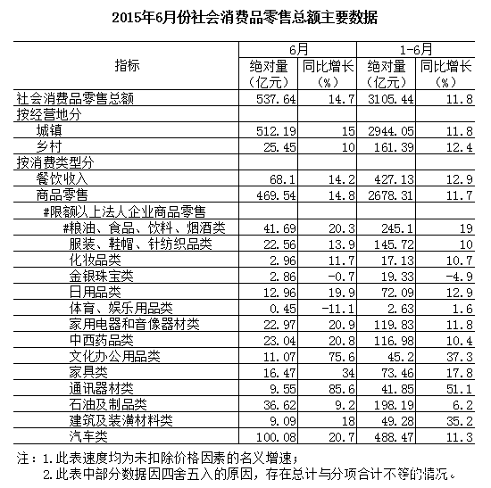6 月份,全市实现社会消费品零售总额 537.64亿元,同比名义增长 14.7%;扣除价格因素, 实际增长 14.2% (以下均为名义增长)。