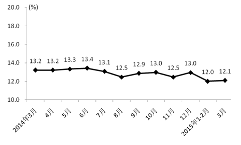 2015 年 3月份重庆社会消费品零售总额增长 12.1%