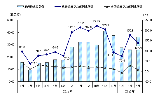 重庆对外贸易 以加工贸易和笔电出口为 支撑 , 规模迅速扩大,成倍增长, 与全国外贸走低形势形成鲜明对比(见图 1) 。 2012 年一季度, 全市进出口 保持翻番,增速继续全国第一。 实现进出口总额 89.87亿美元,同比增长 1.2倍; 其中,出口总额 58.42亿美元,同比增长 1.5倍;进口总额 31.45亿美元,同比增长 79.2%。一季度,重庆市进出口、出口和进口总值在全国位次继续提高,分别列全国第 13位、 13位和 16位,列西部地区第 2位、 2位和 3位(出口仅次于四川,进口仅次于四川和广西);重庆市进出口、出口、进口的增速分别列全国第 1位、 1位和 2位(进口仅次于河南),均列西部地区第 1位,高出全国平均水平 114.3、 146.3和和 72.3个百分点。