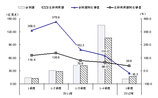 一季度,全市外商独资企业新批项目 36个,同比增长 9.1%;签订合同外资 7.68亿美元,同比增长 21.3%;实际利用外资 9.67亿美元,同比增长 83.1%,占全市总量的 54.7%。中外合资企业新批项目 13个,同比下降 43.5%;签订合同外资 3.40亿美元,同比增长 1.4倍;实际利用外资 7.21亿美元,同比增长 5.0倍,占全市总量的 40.8%。