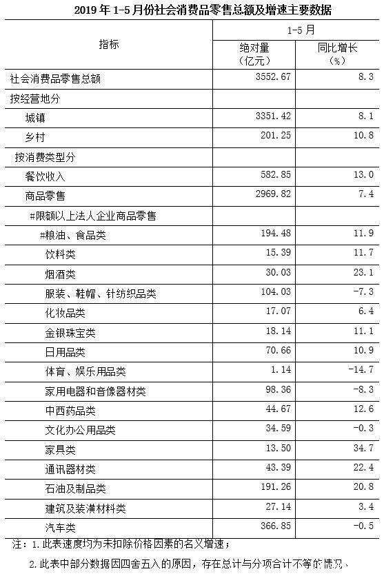 按经营单位所在地分,1-5月份,城镇消费品零售额3351.42亿元,同比增长8.1%;乡村消费品零售额201.25亿元,同比增长10.8%。