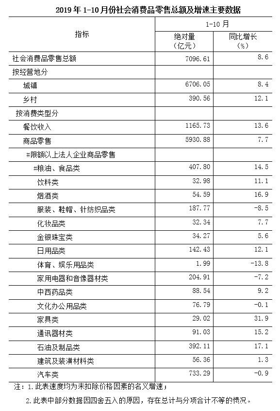 按经营单位所在地分,1-10月份,城镇消费品零售额6706.05亿元,同比增长8.4%;乡村消费品零售额390.56亿元,同比增长12.1%。
