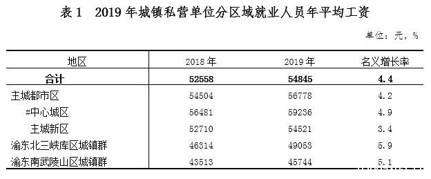 分区域看,城镇私营单位就业人员年平均工资由高到低依次是主城都市区、渝东北三峡库区城镇群和渝东南武陵山区城镇群,分别为56778元、49053元和45744元;同比名义增长率从高到低依次为渝东北三峡库区城镇群5.9%、渝东南武陵山区城镇群5.1%和主城都市区4.2%。