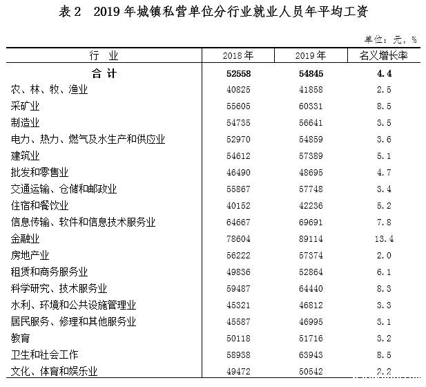 从平均工资的增长速度来看,增速最高的三个行业依次为金融业,采矿业以及卫生和社会工作,增长率分别为13.4%、8.5%和8.5%。增速最低的三个行业依次为房地产业,文化、体育和娱乐业以及农、林、牧、渔业,增长率分别为2.0%、2.2%和2.5%。全部18个行业门类中,有9个行业的平均工资增速高于全市平均水平。