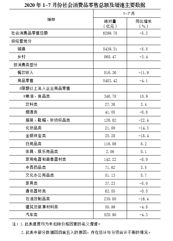 20201-7月份,全市实现社会消费品零售总额6299.78亿元,名义同比下降5.2%,较去年同期回落13.9个百分点;扣除价格因素,实际下降8.1%,较去年同期回落15.6个百分点(以下均为名义增长)。