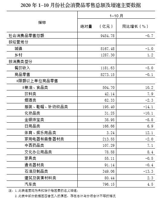 2020年1-10月份,全市实现社会消费品零售总额9454.78亿元,名义同比下降0.7%;扣除价格因素,实际下降3.2%(以下均为名义增长)。
