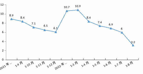 2022年1-8月份,全市固定资产投资(不含农户)同比增长3.2%。其中,民间固定资产投资同比下降3.4%。