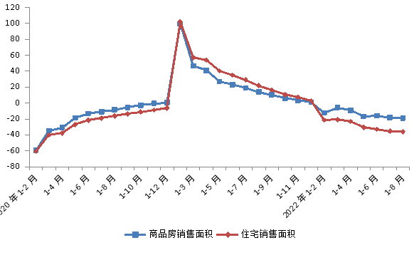 1-8月,房地产开发企业房屋施工面积22078.82万平方米,同比下降13.7%。其中,住宅施工面积14634.23万平方米,同比下降13.2%。房屋新开工面积1606.96万平方米,同比下降52.2%。其中,住宅新开工面积1125.03万平方米,下降50.3%。房屋竣工面积1465.51万平方米,同比下降39.9%。其中,住宅竣工面积988.79万平方米,同比下降39.2%。