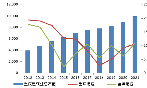 十八大以来,随着经济建设的推进,重庆建筑业积极应对市场风险挑战,保持整体稳定发展,产业规模不断扩大。2021年,全市建筑业实现总产值9943.01亿元,比2012年增长1.5倍,2013-2021年年均增长10.7%;实现建筑业增加值3296.26亿元,比2012年增长2.2倍,占GDP的比重达到11.8%,比2012年提高3.0个百分点,2013-2021年年均增长9.8%,国民经济支柱产业地位进一步巩固。