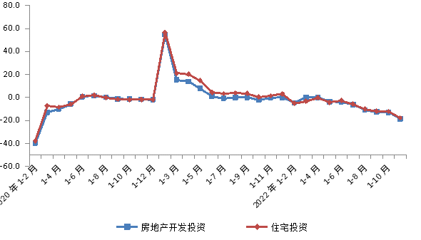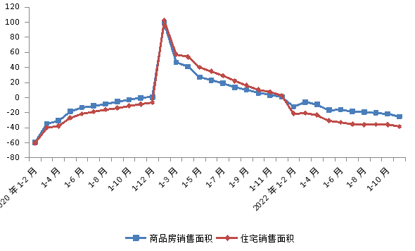 1-11月,房地产开发企业房屋施工面积22510.79万平方米,同比下降15.6%。其中,住宅施工面积14930.65万平方米,同比下降15.0%。房屋新开工面积2039.62万平方米,同比下降54.9%。其中,住宅新开工面积1420.93万平方米,下降52.8%。房屋竣工面积2016.47万平方米,同比下降38.9%。其中,住宅竣工面积1358.52万平方米,同比下降37.6%。