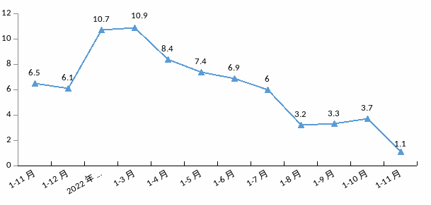 2022年1-11月份,全市固定资产投资(不含农户)同比增长1.1%。其中,民间固定资产投资同比下降7.6%。