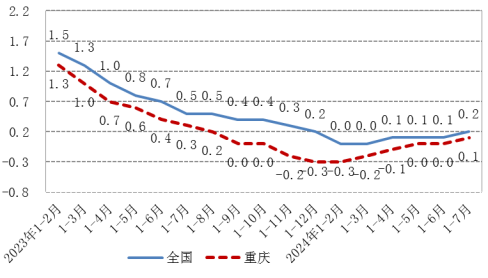 1—7月,全市居民消费价格同比上涨0.1%,低于全国CPI增速0.1个百分点,低于3%以内的涨幅控制水平。增速比上年同期下降0.2个百分点,分别比一季度、1—6月提高0.3、0.1个百分点。