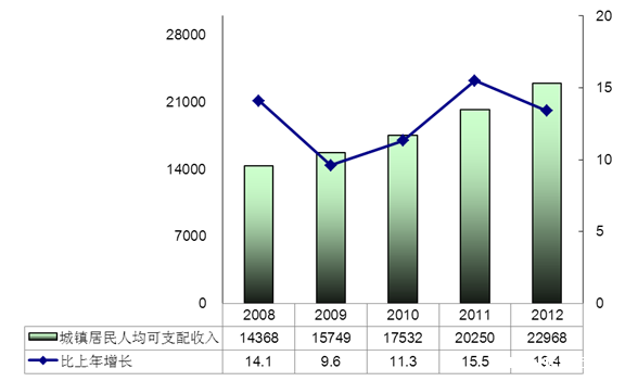 图 8 2008- 2012年城镇居民人均可支配收入及增长速度
