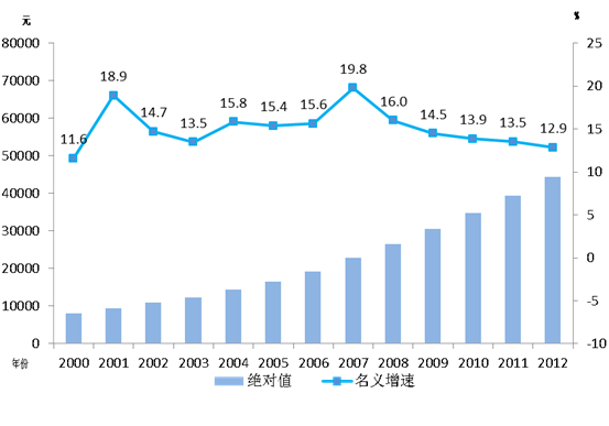 2012年全市城镇非私营单位就业人员年平均工资为44498元,与2011年的39430元相比,增加了5068元,同比名义增长12.9%,增幅回落0.6个百分点。其中,在岗职工平均工资45392元,同比名义增长13.4%,增幅加快0.1个百分点。扣除物价因素,2012年全市城镇非私营单位就业人员年平均工资实际增长10.0%