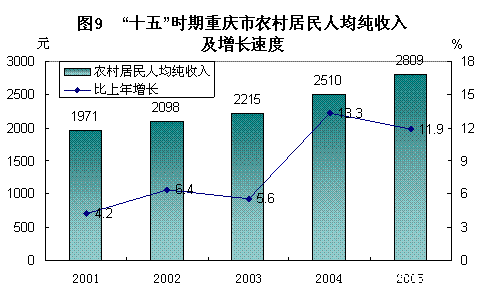 全年农村居民人均纯收入2809元,比上年增加299元,增长11.9%。全年农民人均工资性收入1089元,增长16.9%;人均家庭经营纯收入1541元,增长8.6%;人均转移性收入148元,增长17.0%。农村居民家庭经营费用人均支出839元,比上年增长20.5%;人均生活消费支出2142元,增长15.5%,其中用于交通通讯、家庭设备用品、文化教育娱乐消费、医疗保健和其他消费分别增长36.2%、28.0%、25.7%、23.7%和26.9%。农村居民家庭恩格尔系数为52.8%。农村居民人均住房面积32.9平方米,比上年增加0.4平方米。