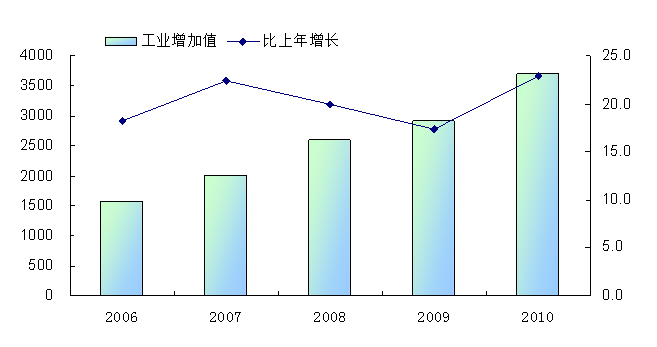 从支柱产业看,汽车摩托车行业总产值2781.71亿元,增长23.7%,占规模以上工业总产值的30.6%;装备制造业总产值1655.41亿元,增长38.0%,占规模以上工业总产值的18.2%;材料工业总产值1334.68亿元,增长37.3%,占规模以上工业总产值的14.7%;电子信息产业总产值400.90亿元,增长48.1%,占规模以上工业总产值的4.4%。