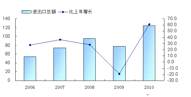 全年进出口总额124.26亿美元,比上年增长61.1%。其中,出口74.89亿美元,同比增长75.0%;进口49.38亿美元,同比增长43.9%。机电产品出口50.02亿美元,增长70.5%,占出口总额的66.8%。