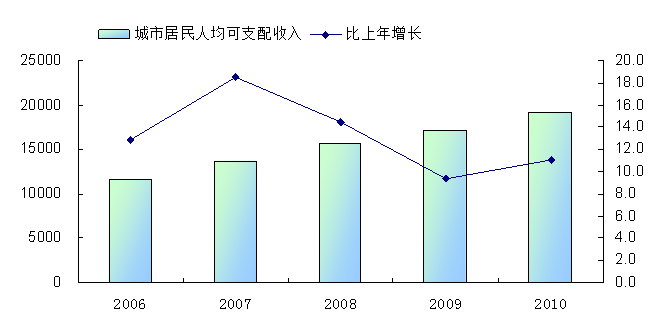 图7“十一五”期间城市居民人均可支配收入及其增长速度