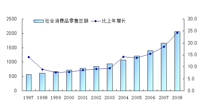 全年社会消费品零售总额2064.09亿元,比上年增长24.3%,扣除价格因素,实际增长18.4%。分城乡看,市实现社会消费品零售额1266.13亿元,增长26.7%;县实现社会消费品零售额269.67亿元,增长23.1%;县以下实现社会消费品零售额528.29亿元,增长19.4%。分行业看,批发零售贸易业零售额1724.17亿元,增长24.4%;住宿和餐饮业零售额295.12亿元,增长25.2%;其他行业零售额44.80亿元,增长14.0%。