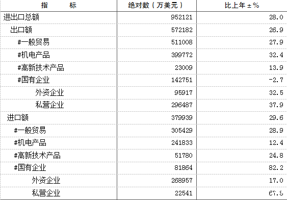 全年进出口总额95.21亿美元,比上年增长28.0%。其中,出口57.22亿美元,增长26.9%;进口37.99亿美元,增长29.6%。机电产品出口39.98亿美元,增长32.4%,占出口总量的69.9%。