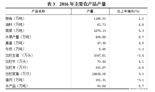 全年粮食播种面积3375.10万亩,比上年增长0.7%。粮食综合单产345.5公斤/亩,增长0.2%。油料播种面积479.96万亩,增长3.4%。蔬菜播种面积1120.59万亩,增长2.1%。水果种植面积540.38万亩,增长2.8%。中药材种植面积184.76万亩,增长8.7%。