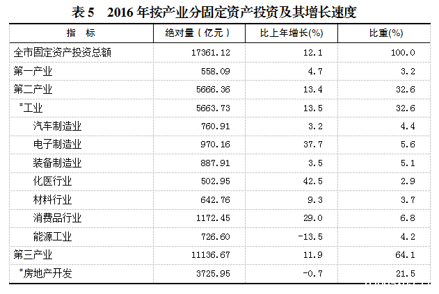 全年完成固定资产投资总额17361.12亿元,比上年增长12.1%。其中,基础设施建设投资5660.87亿元,比上年增长30.0%,占全市固定资产投资的32.6%;民间投资8858.50亿元,增长11.0%,占全市固定资产投资的比重为51.0%。