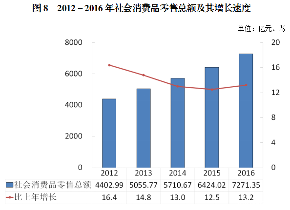 全年实现社会消费品零售总额7271.35亿元,比上年增长13.2%,扣除价格因素,实际增长11.7%。按经营地统计,城镇消费品零售额6905.74亿元,增长13.1%;乡村消费品零售额365.61亿元,增长14.8%;按消费类型统计,商品零售额6244.40亿元,增长13.0%;餐饮收入额1026.95亿元,增长14.5%。