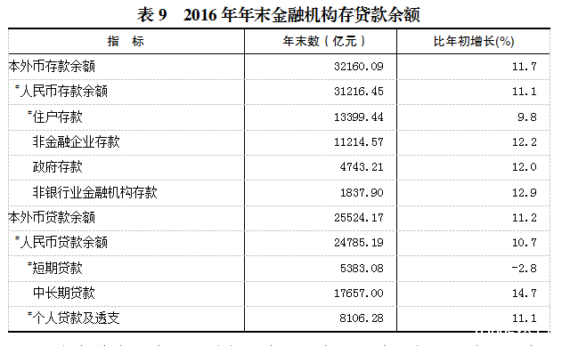 年末全市金融机构本外币存款余额为32160.09亿元,比年初增加3374.41亿元。其中,人民币存款余额31216.45 亿元,增加3122.08亿元。金融机构本外币贷款余额为25524.17亿元,比年初增加2568.42亿元。其中,人民币贷款余额24785.19亿元,增加2390.72亿元。