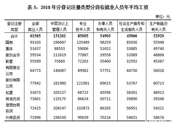 2018年全市规模以上企业就业人员年平均工资为61565元,同比名义增长8.5%。其中,中层及以上管理人员131261元,增长9.5%;专业技术人员85005元,增长18.0%;办事人员和有关人员54903元,增长6.9%;社会生产服务和生活服务人员45066元,增长6.5%;生产制造及有关人员52920元,增长5.1%。中层及以上管理人员平均工资最高,是全部就业人员平均水平的2.13倍;社会生产服务和生活服务人员平均工资最低,是全部就业人员平均水平的73.2%。岗位平均工资最高与最低之比为2.91,比去年扩大0.08。