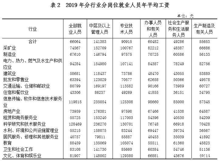 2019年全市规模以上企业就业人员年平均工资为66064元,同比名义增长7.3%。其中,中层及以上管理人员141383元,增长7.7%;专业技术人员90915元,增长7.0%;办事人员和有关人员60482元,增长10.2%;社会生产服务和生活服务人员49286元,增长9.4%;生产制造及有关人员55653元,增长5.2%。中层及以上管理人员平均工资最高,是全部就业人员平均水平的2.14倍;社会生产服务和生活服务人员平均工资最低,是全部就业人员平均水平的74.6%。岗位平均工资最高与最低之比为2.87,比去年缩小0.04。