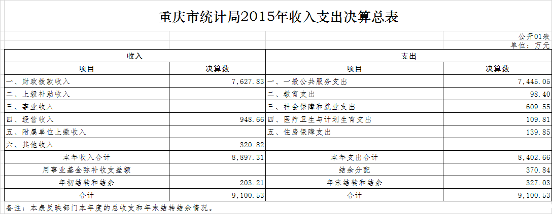 (一)2015年部门决算本年收入8897.31万元,比上年决算数增加370.60万元,比年初预算增加3005.20万元,主要原因是因收入政策波动较大,在编报预算时其他收入预计不足。2015年部门决算本年支出8402.66万元,比上年决算数增加192.88万元,比年初预算数增加2510.55万元,主要原因是增加了重庆市第三次经济普查专项调查及全国1%人口抽样调查专项经费。2015年年末结转和结余为327.03万元,主要为库区经济综合统计信息系统经费。